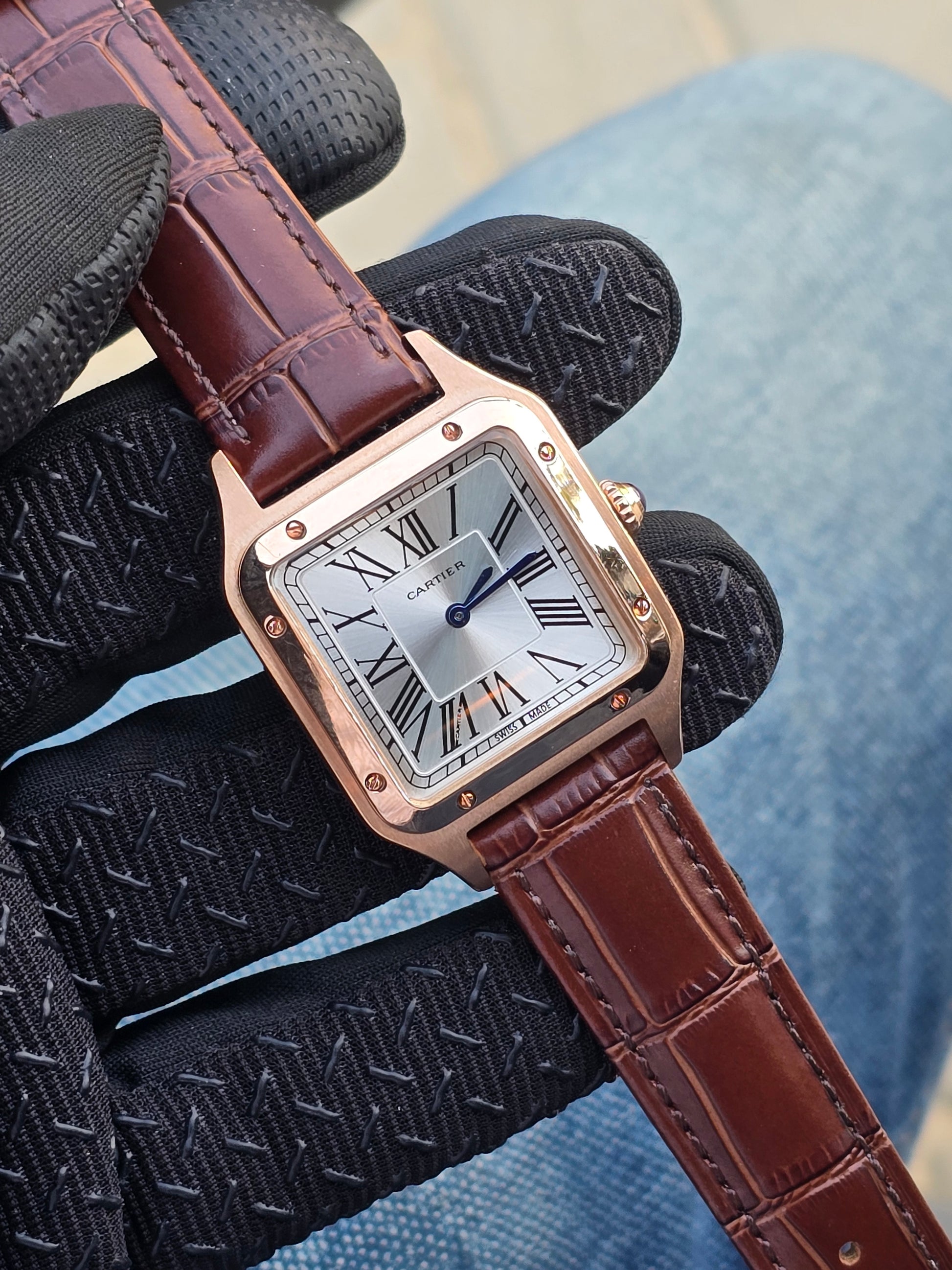 The Cartier Santos Iconic Square Watch features a sleek silver dial complemented by elegant rose gold case and a classic brown strap. Designed for both men and women, this timeless timepiece combines style and versatility for everyday wear.