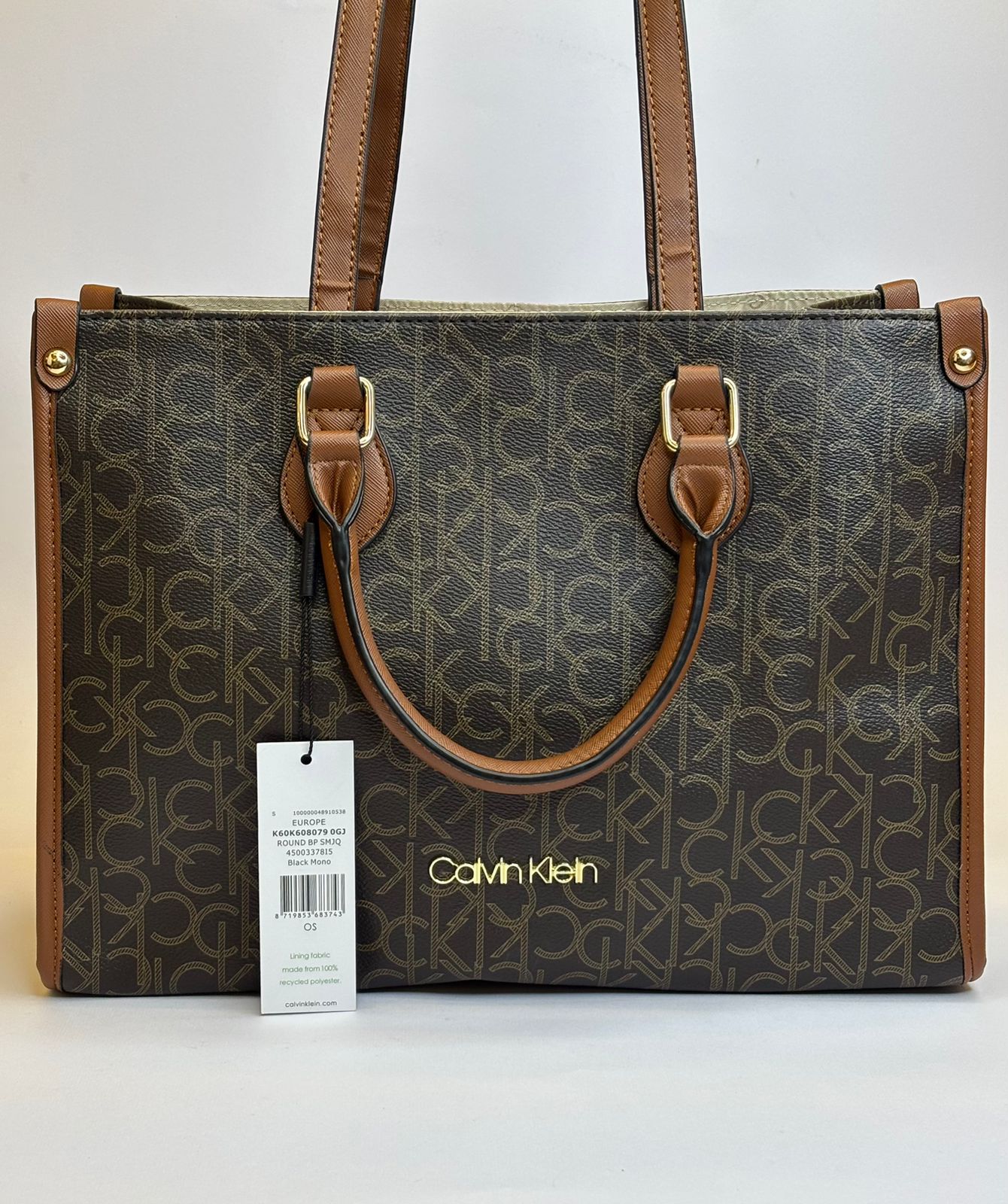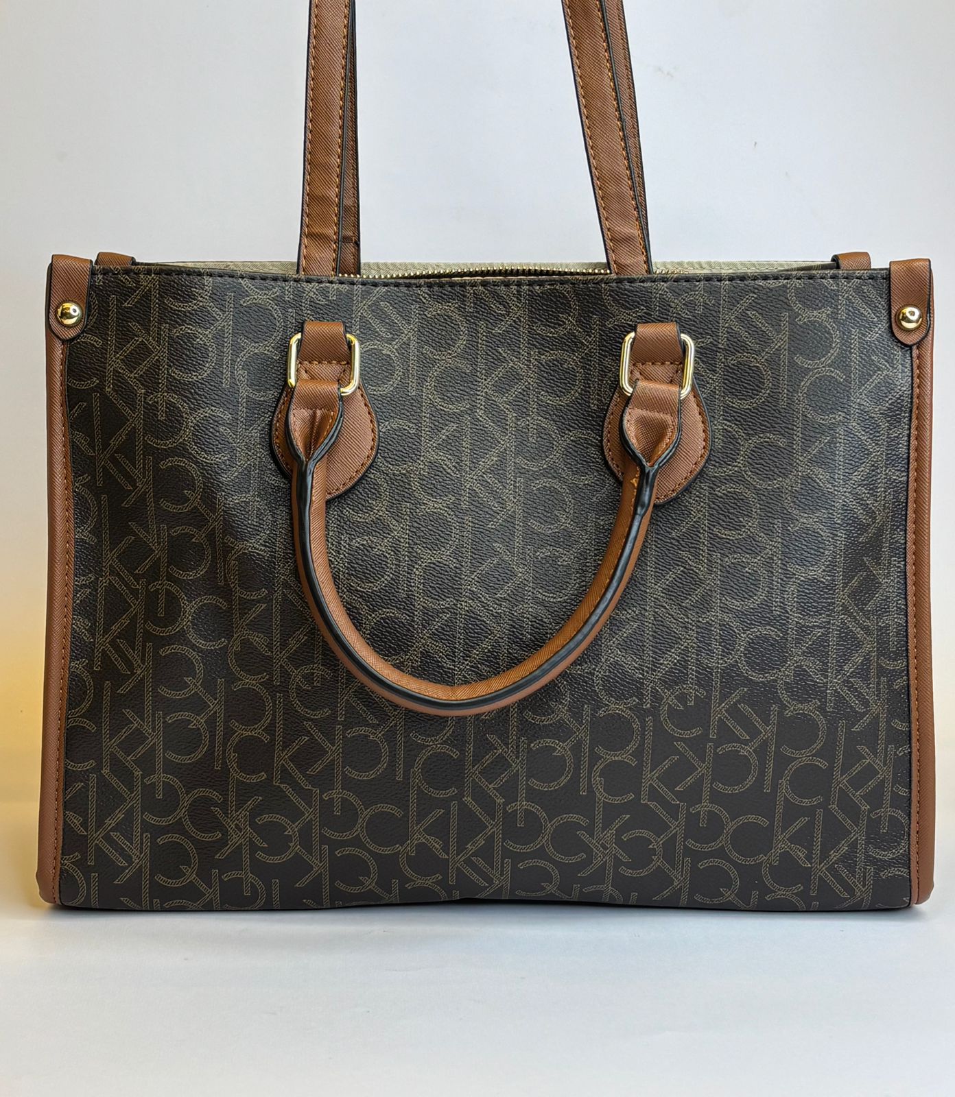 Introducing the CK Brown Monogram Leather Bag for Women. Made with high-quality leather, this bag is both stylish and functional. With a spacious interior and adjustable straps, it's the perfect accessory for any woman on-the-go. Stay organized and fashionable with this must-have bag.
