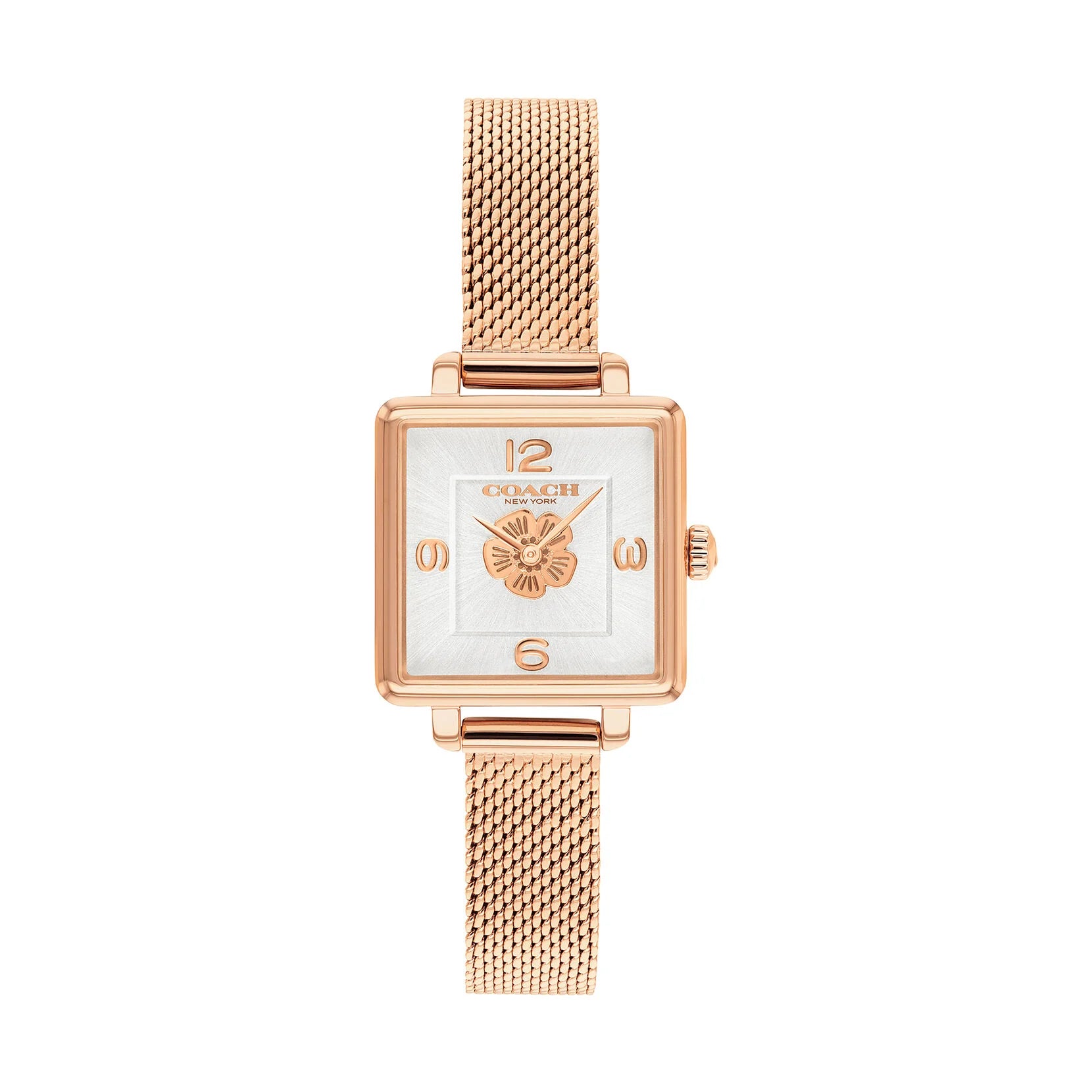 A bold, fashion-forward timepiece that delivers contemporary elegance with distinctive flair. The Coach Cass 14503698 features a petite 22 mm rose-gold square case paired with a sleek mesh bracelet and a delicate white dial adorned with the iconic Coach Tea Rose motif—perfect for women seeking signature design and chic sophistication.