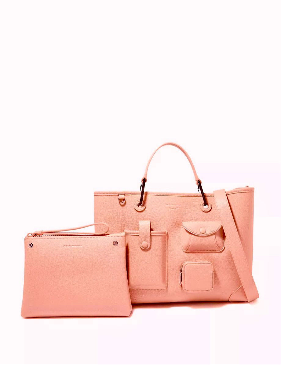This Emporio Armani shoulder bag is presented in a light pink color. It's characterized by its classic tote shape, visible front pockets, and understated elegance. Crafted from a smooth high quality leather, the bag is chosen for durability and a clean aesthetic. The light pink color is a versatile neutral, easily paired with a variety of outfits. The design is defined by minimalist details, focusing on the practical front pockets and subtle branding.