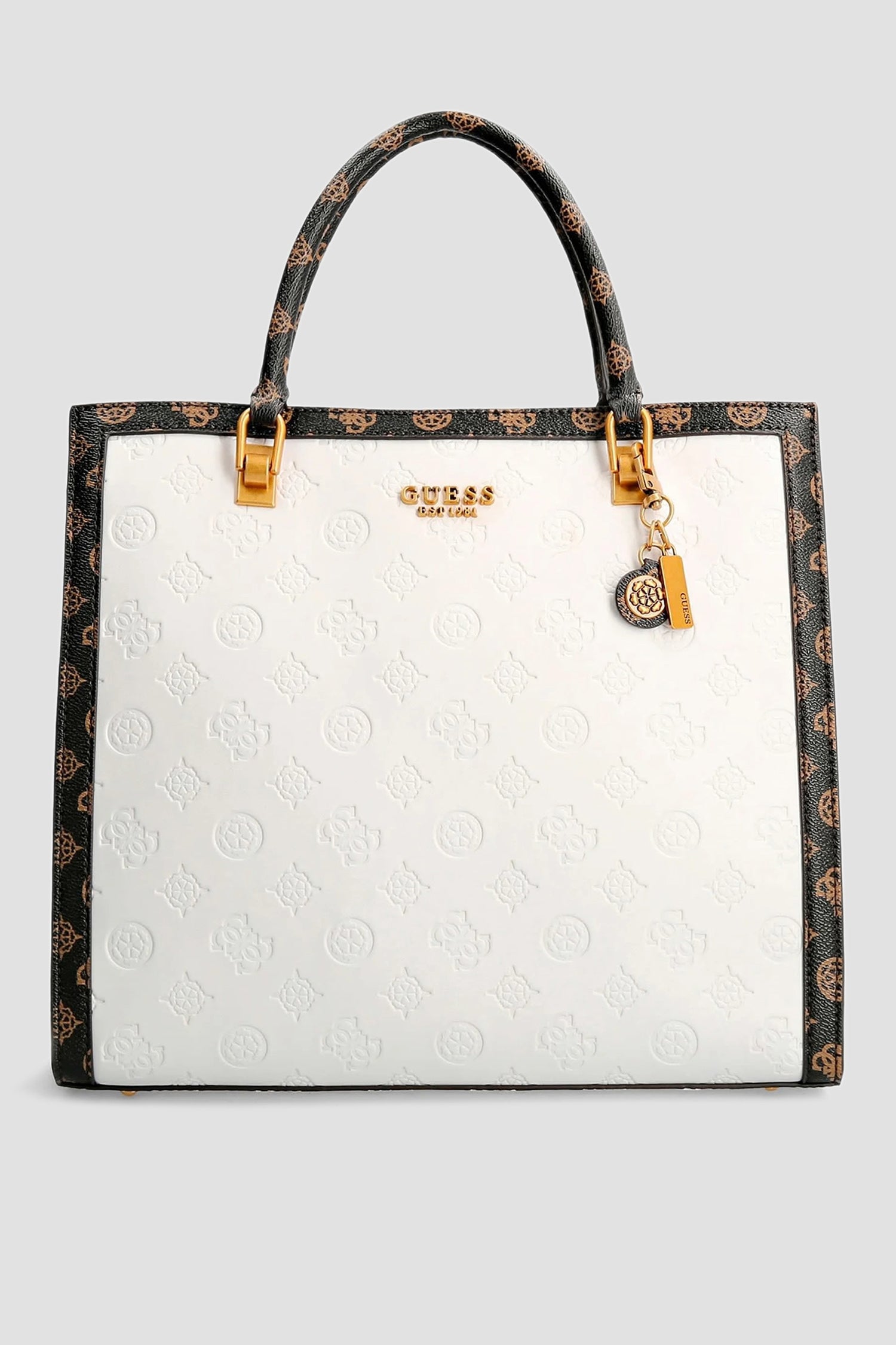 The Guess Bag For Women is a stylish and sophisticated addition to any wardrobe. Its structured tote design in two-tone white and brown is perfect for both casual and formal occasions. With its embossed logo design, this bag is sure to make a statement and keep all your belongings organized.