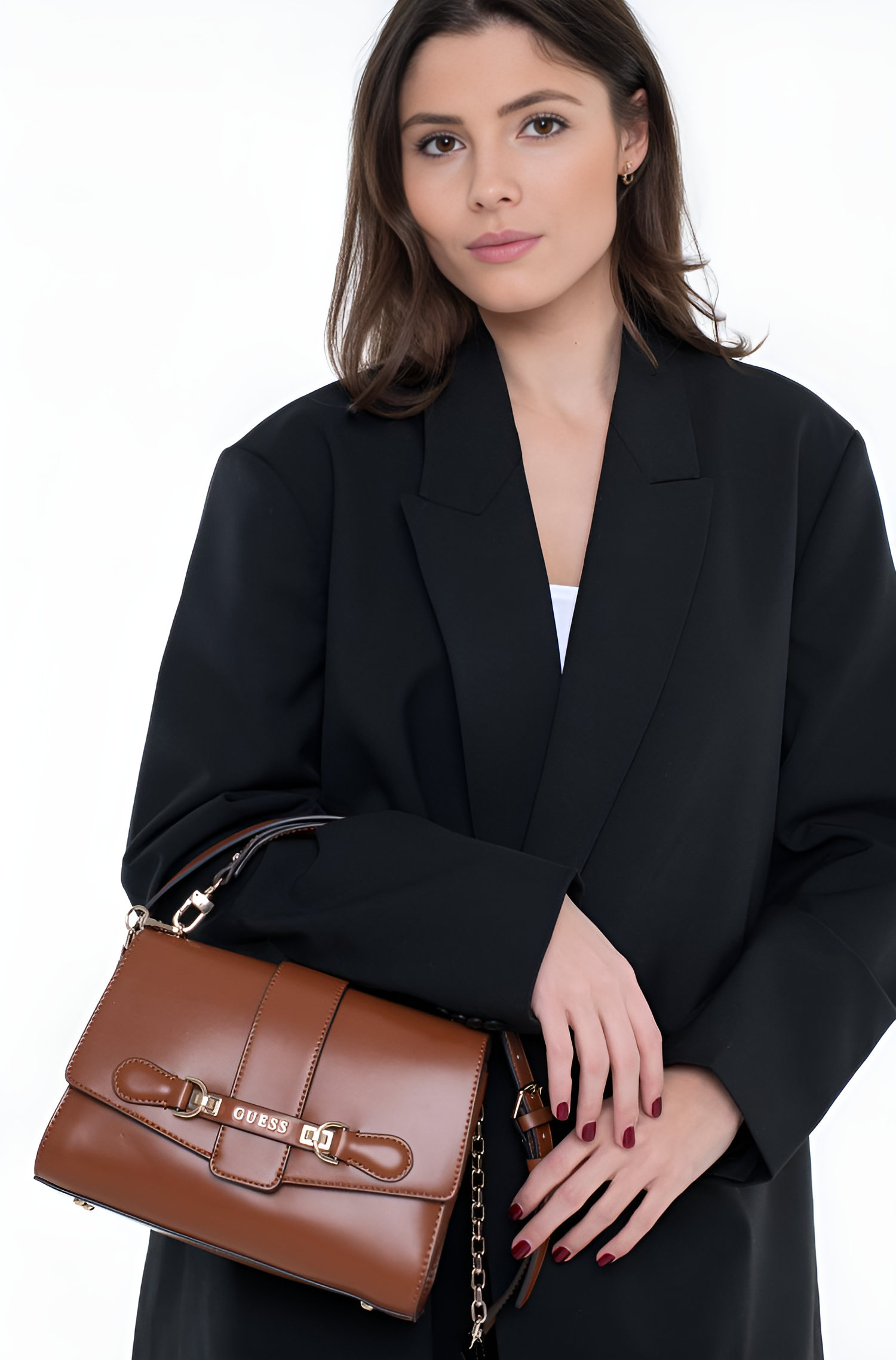 Elevate your accessory game with the sophisticated Guess Top Handle Satchel. This elegant handbag features a rich brown tone and a structured silhouette, making it a timeless addition to any wardrobe. The standout element is its distinctive front flap, secured by a unique strap with hardware and a central Guess logo plaque. Designed for ultimate versatility, it comes with both a comfortable top handle for classic carrying and a detachable, adjustable cross body strap for hands-free convenience.