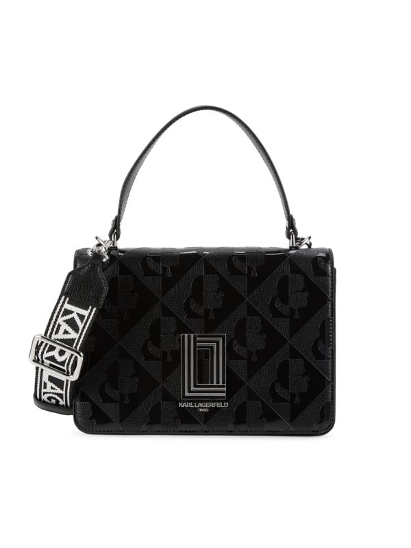 This Karl Lagerfeld handbag is a stylish and contemporary accessory designed for fashion-forward individuals. The bag features a sleek black color with a monogram pattern showcasing Karl Lagerfeld’s iconic silhouette in a geometric design, giving it a modern and luxurious appeal. Made from high-quality leather.