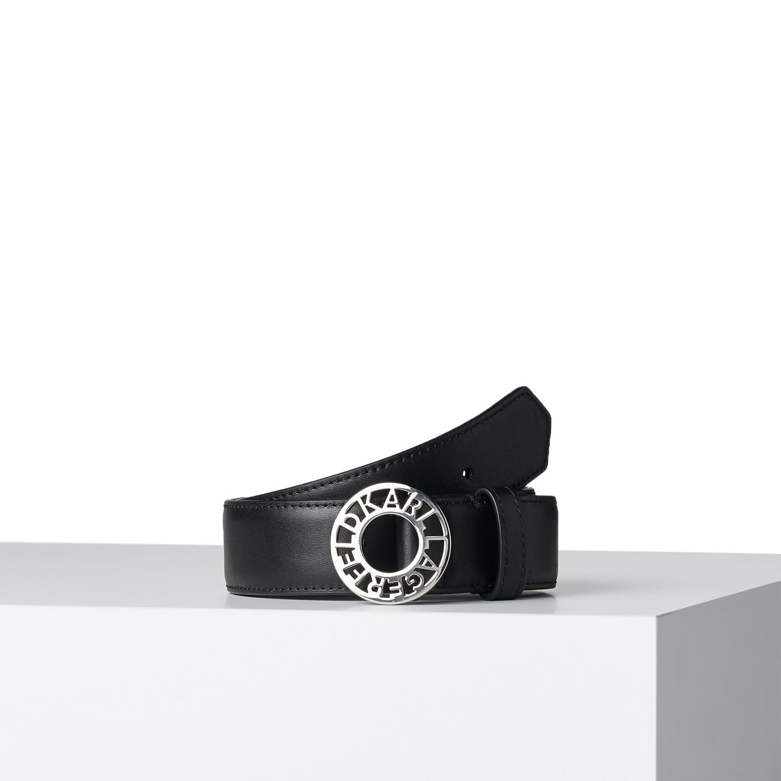 - Buckle: Prominent circular silver-tone metal buckle with intricate "KARL LAGERFELD" lettering cut out.