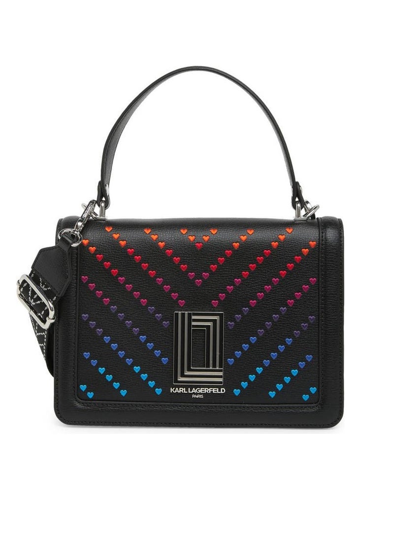Infuse your everyday look with a touch of playful sophistication with the Karl Lagerfeld Paris Simone Cross body Bag. Crafted from luxurious black leather, this chic bag features a vibrant, rainbow-hued heart motif that adds a whimsical charm. The iconic Karl Lagerfeld logo hardware provides a signature touch.