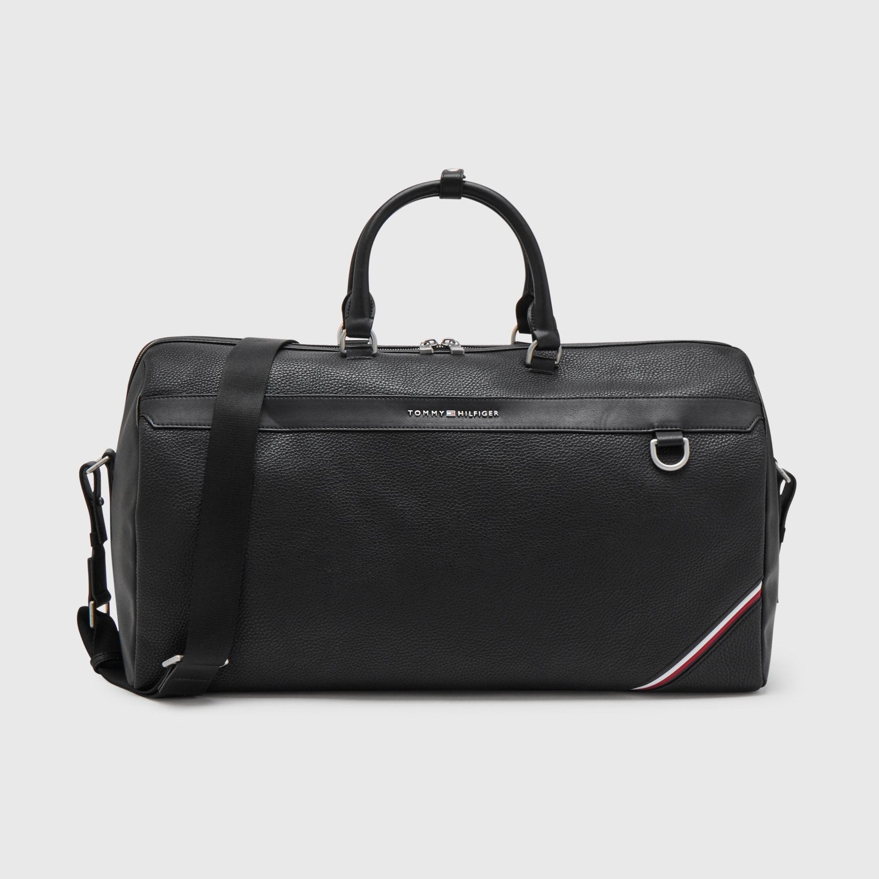 Carry your essentials in style with the TH Black Leather Duffle Bag. Made from high quality materials, this bag is both durable and fashionable. Perfect for the modern man on the go, it provides ample space and comfort for your travels. Elevate your look and make a statement with this must-have accessory.